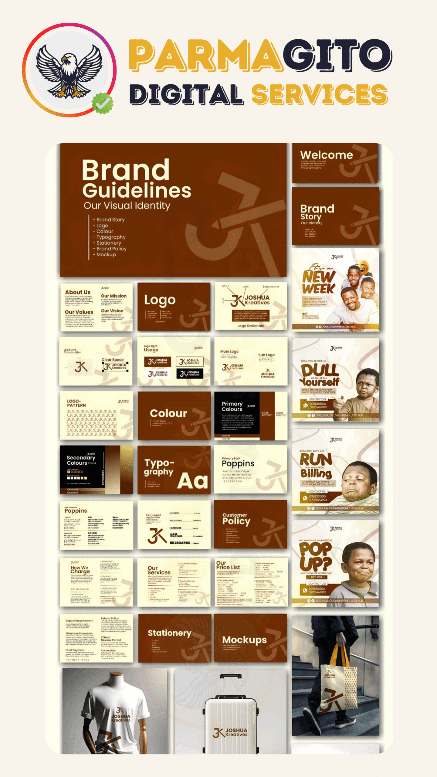 تشمل تصميم الشعار، الألوان، الخطوط، دليل الهوية البصرية، والعناصر التسويقية التي تبرز شخصية العلامة التجارية.