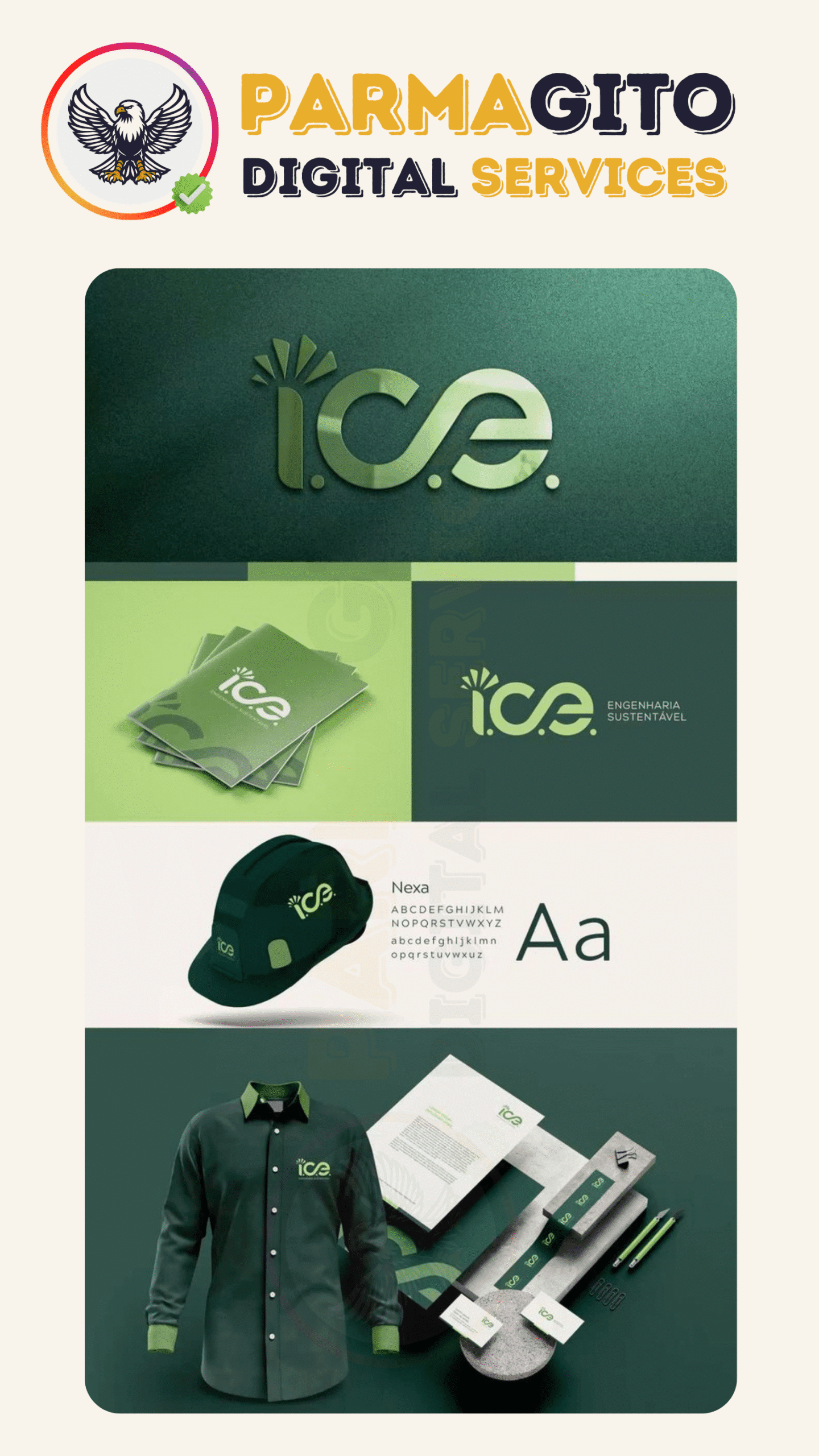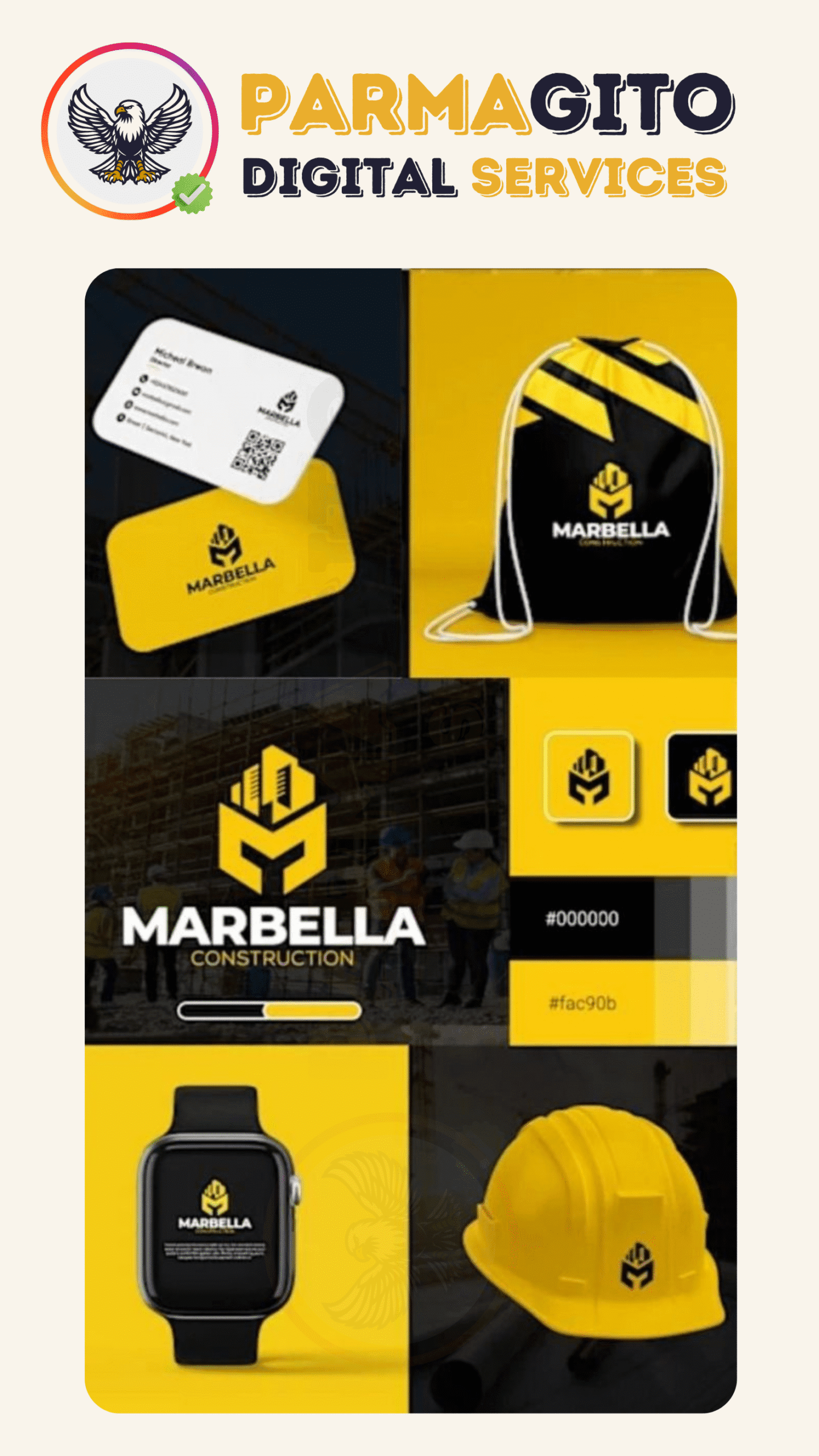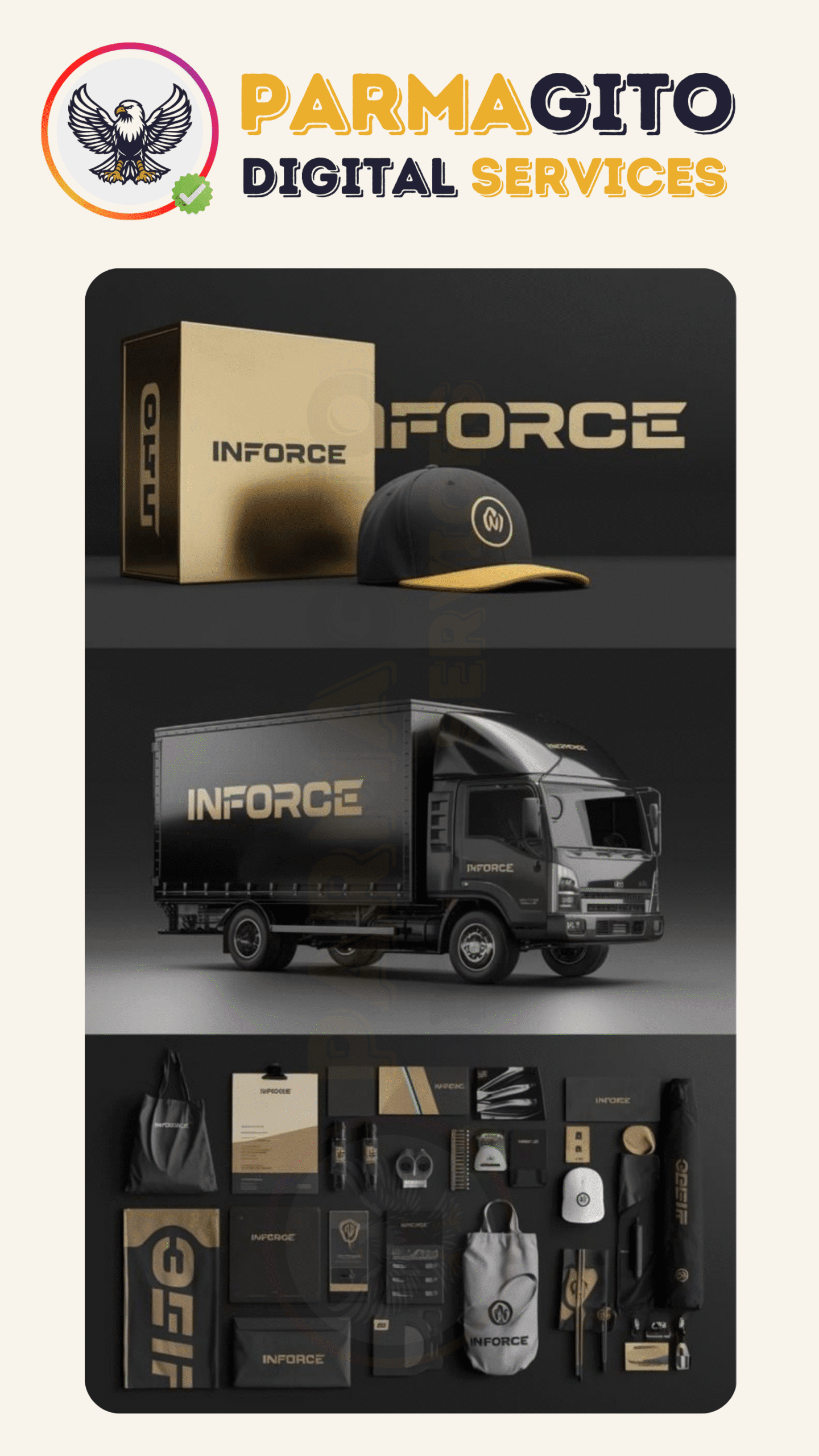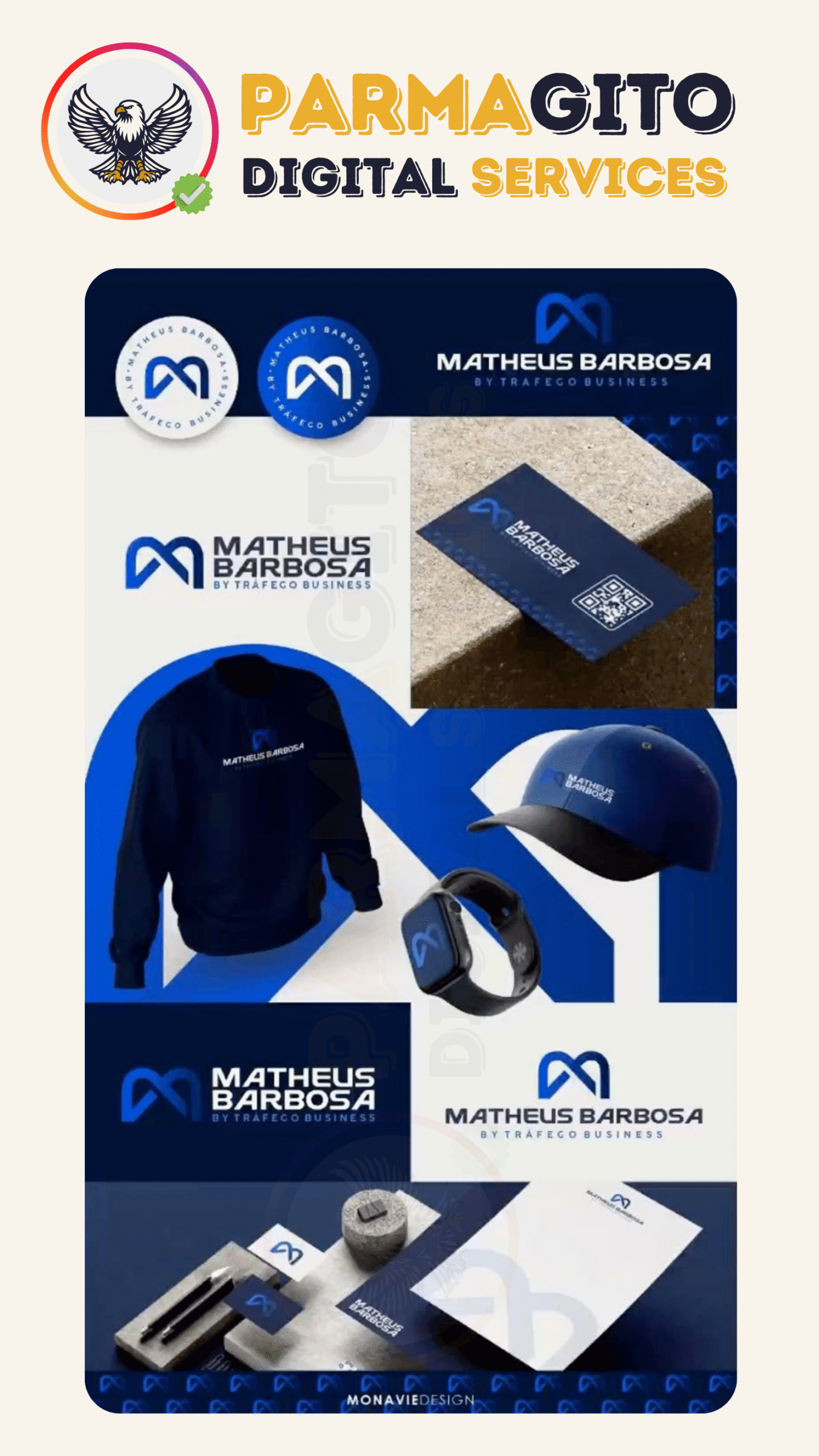 - Examples of Parmagito’s branding and design services, including logo design, visual identity, and business cards – crafted to strengthen your brand.